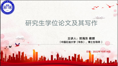 20/ 2022-10管理学院邀请郑海东教授为师生作研究生学位论文及写作专题讲座10月14日,管理学院邀请中国石油大学(华东)博士生导师郑海东教授,通过“腾讯会议”网络平台开展了题为“研究生学位论文及其写作”的专题讲座。讲座由管理学院副院长张倩主持,共有300名教师和研究生参加了本次讲座。郑教授坚持需求导向和问题导向,讲座内容层层递进、视角独特、逻辑清晰,从“什么是学位论文?”、“为什么要写学位论文?”、“学位论文工作一般过程”等方面,强调了学位论文撰写规范的重要性,系统梳理了研...