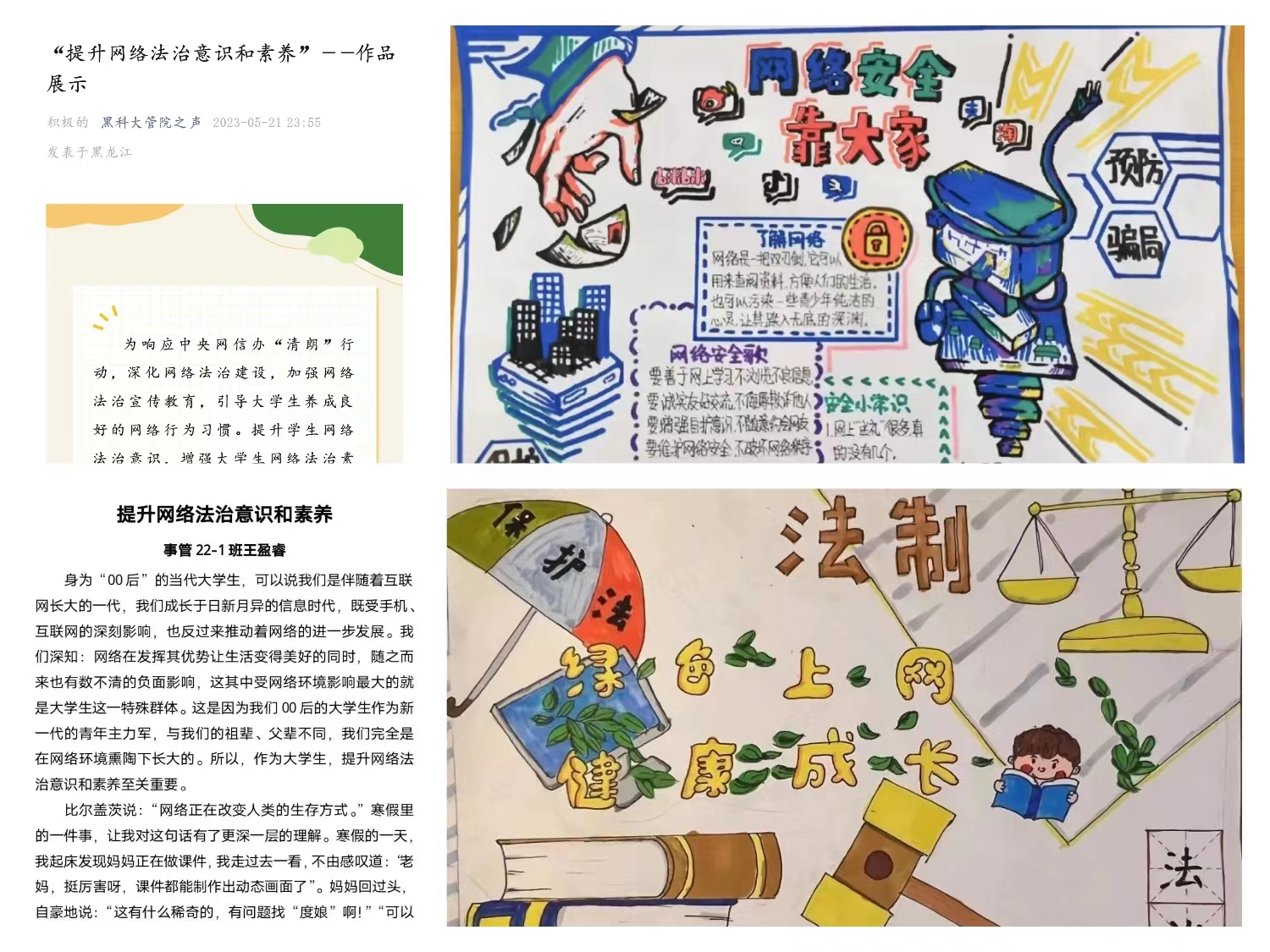 25/ 2023-05马克思主义学院开展“提升网络法治意识和素养”专题思想教育活动结合《关于在全校学生中开展“提升网络法治意识和素养”专题思想教育活动的实施方案》文件要求,为响应中央网信办“清朗”行动,深化网络法治建设,加强网络法治宣传教育,引导大学生养成良好的网络行为习惯,5月4日-5月25日,马克思主义学院在全体青年学生中开展“提升网络法治意识和素养”专题思想教育活动。丰富网络法治教育多样性,营造法治学习“新浪潮”。进一步强化使命担当,加大网络普法载体创新力度,营造学法、守法...