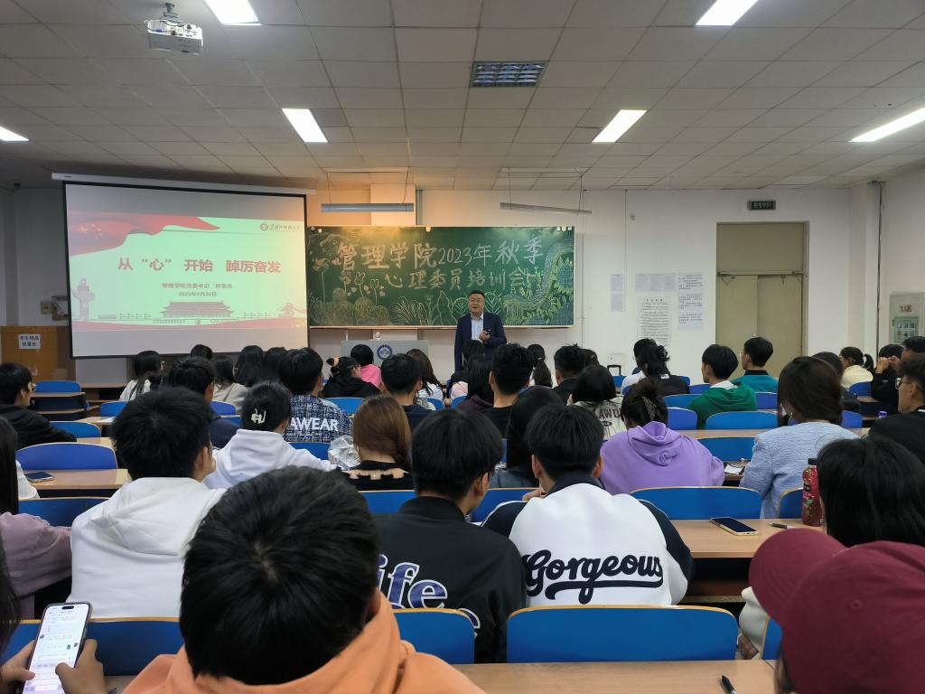 09/ 2023-10从“心”开始,踔厉奋发 管理学院开展2023年秋季心理委员培训会为提高学院心理健康教育工作质量,充分发挥心理委员在朋辈心理辅导的优势和作用,积极响应《开云app登录入口第三届“久爱我·Three-Double”9·25大学生心理健康教育活动方案》,管理学院于近期在主楼WN0303教室开展了2023年秋季心理委员培训会。本次培训会由管理学院党委书记何景洋主讲,学院全体心理委员参加了本次培训会。何景洋巧妙结合“二十四节气”,用通俗易懂的语言和生动形象的范例,点出“从“心”开始,踔厉奋发”的培...