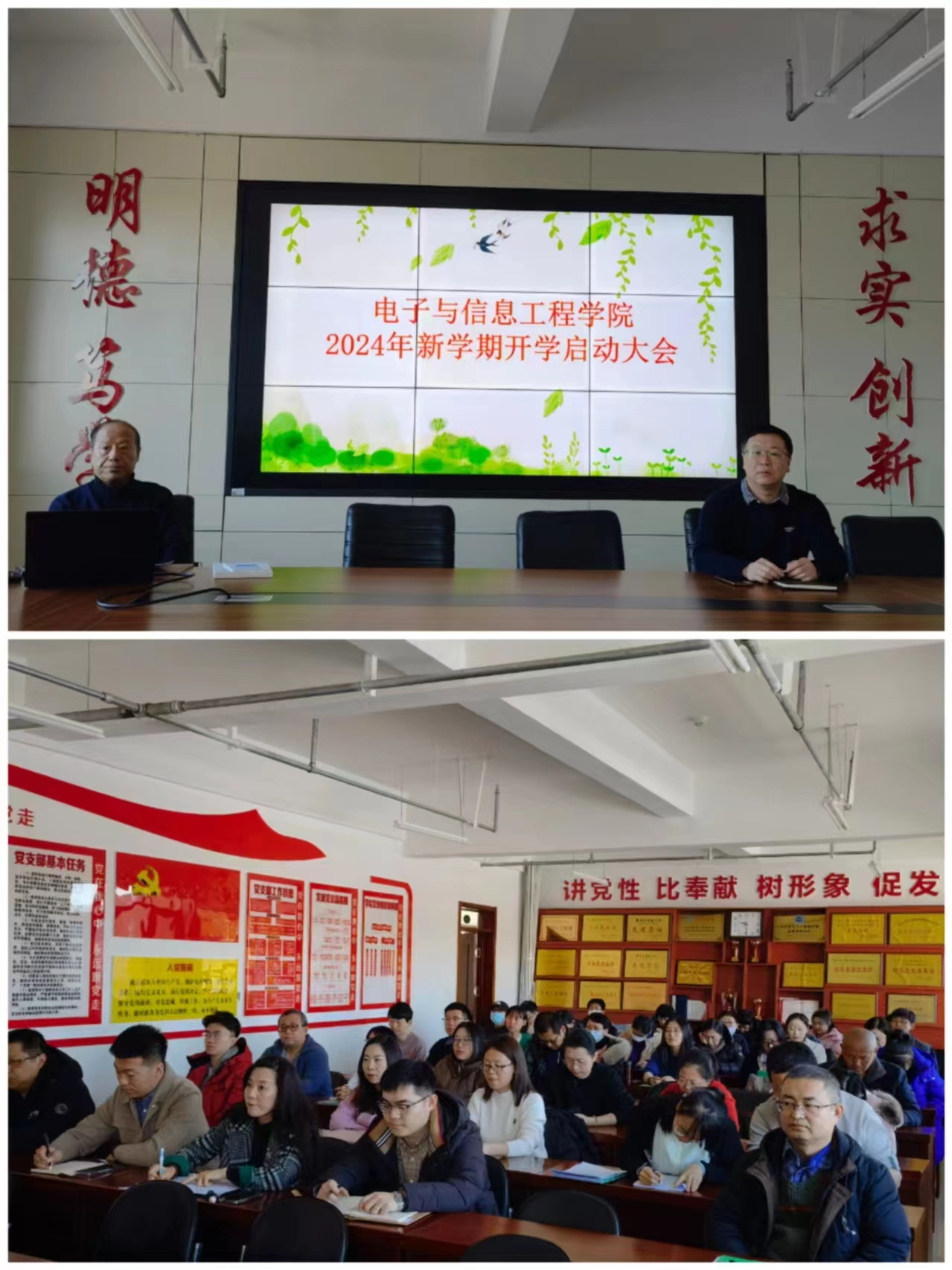 23/ 2024-02电子与信息工程学院召开新学期工作启动会议2月23日上午,电子与信息工程学院在朝阳楼0809会议室召开新学期工作启动会议。学院领导班子成员、全体教职工参加会议,会议由学院党委书记齐秀强主持。会上,学院院长杨庆江对学院2023年各项工作进行了总结,对本学期审核性评估重点工作进行了讲解,同时对教学、科研、人才引进、就业等方面工作提出了具体要求。学院党委书记齐秀强在会上讲话。他强调,当前学校正处关键时期,审核评估和博士点申报等重要工作继踵而至,面临难得...