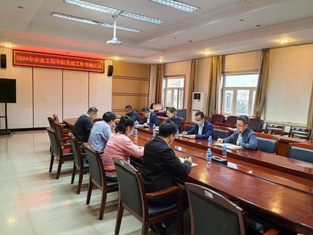 19/ 2024-04【党纪学习教育】安全工程学院召开党建工作专题会议4月15日,学院党委在二楼会议室召开党委会扩大会议,专题研究党建工作。学院领导班子成员,教师党支部书记、副书记,学生党支部书记参加了会议。会议由学院党委书记王娟主持。会议首先进行“第一议题”,学习习近平总书记在《求是》上发表的文章《必须坚持人民至上》。研究学院教师党支部人员调整、学院党支部书记例会制度。认真学习学校党委下发的《在全校开展党纪学习教育的实施方案》,并结合学院实际,研究部署学院近期党建...