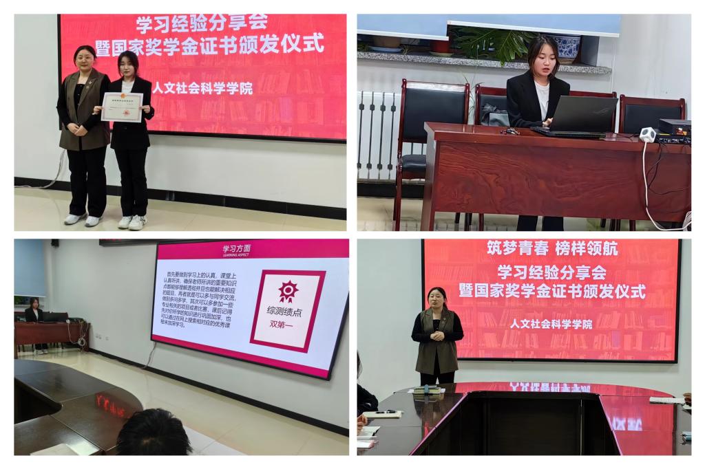 19/ 2024-04人文学院召开“筑梦青春 榜样领航”学习经验分享会暨国家奖学金证书颁发仪式为深入贯彻落实开云(中国)“永葆赤心 立德践行 勤学善思 笃行担当”主题思想教育相关要求,充分发挥榜样示范引领作用,营造积极向上的学习氛围,人文学院于4月18日在朝阳楼0317室召开了“筑梦青春 榜样领航”学习经验分享会暨国家奖学金证书颁发仪式。会上,辅导员巩冬阳为国家奖学金获得者社会工作22-1班张恩熙颁发国家奖学金证书,并对其在学习态度、党团活动、学科竞赛、社会实践等方面取得的成绩表示肯定,勉励她在未来的学习和工...