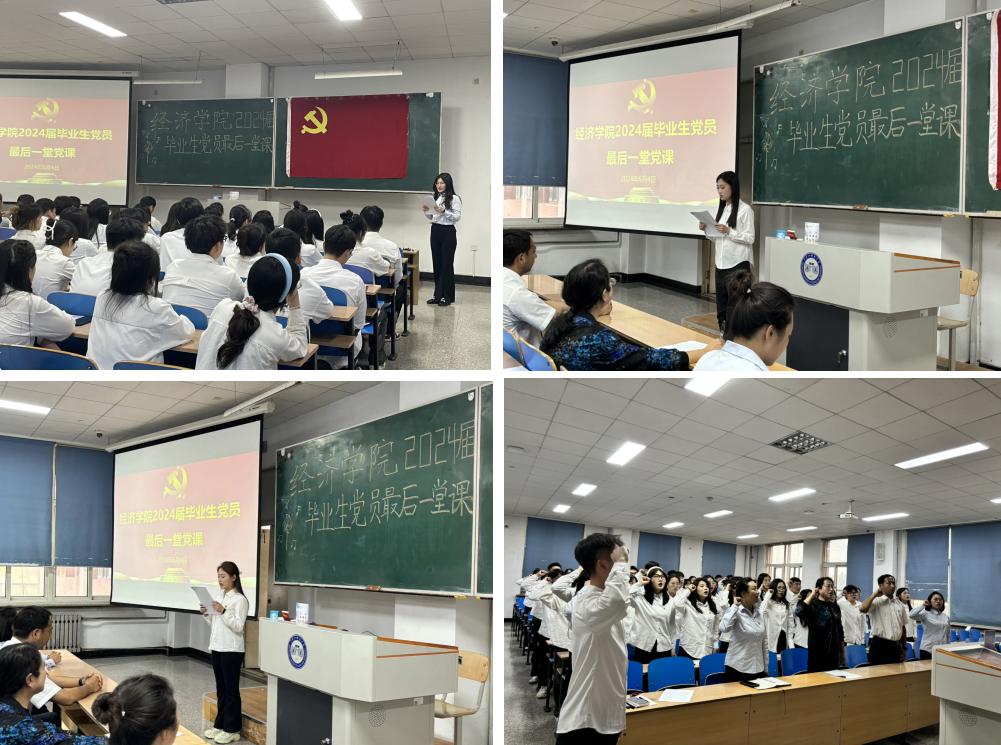 05/ 2024-06经济学院开展“2024届毕业生党员最后一堂党课”在毕业来临之际,为深入学习贯彻习近平新时代中国特色社会主义思想、扎实推进党纪学习教育,切实抓好党员的党性教育,为使毕业生党员在今后的学习和工作中更好地发挥党员的先锋模范作用,经济学院于6月4日下午在主楼WN0203开展“2024届毕业生党员最后一堂党课”。经济学院党委书记雷金屹,学院副书记邬丽群,学生各党支部书记及全体毕业生党员参加了此次党课。在党课开始前,首先由毕业生党员代表李文青和陈钰潇同志分别带领大...