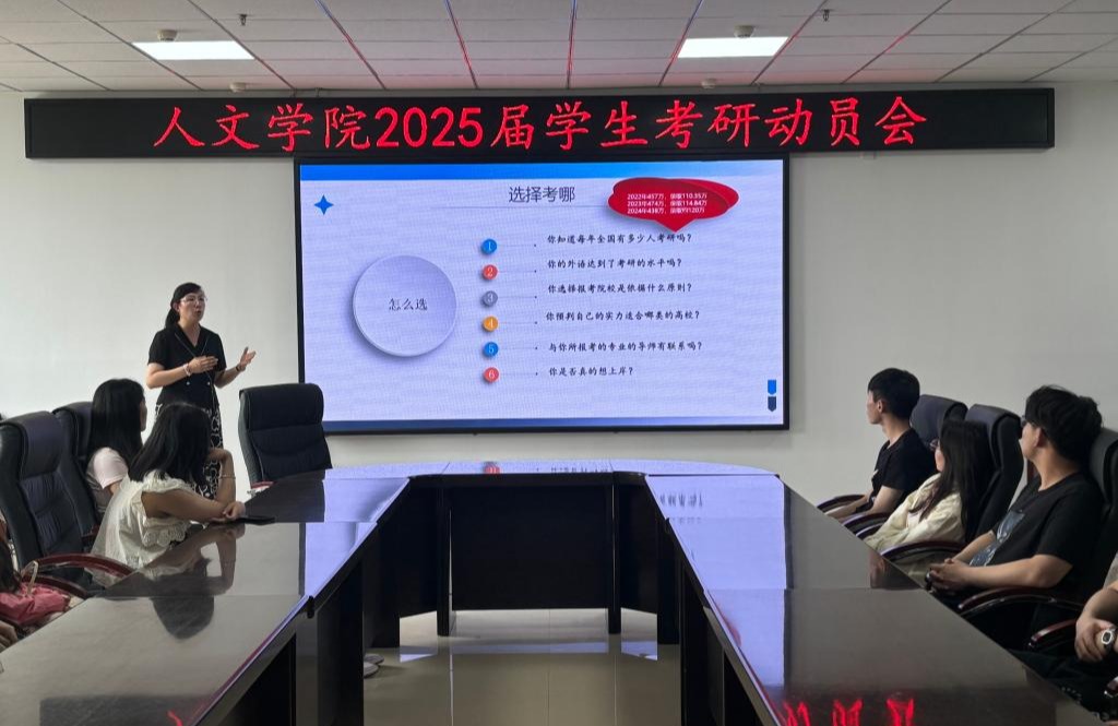 21/ 2024-06人文学院召开2025届学生考研动员会为积极调动2025届学生考研积极性,帮助学生明确考研目标、理性选择目标院校,6月20日,人文学院在朝阳楼0317会议室召开2025届学生考研动员会,院长曹景萍主讲,2025届有考研意向学生参加会议,会议由辅导员韩雪主持。曹景萍以《正确定位专注于心》为主题作指导发言,首先简述本次考研动员大会的目的和意义,从当前就业形势、专业发展趋势等方面分析考研对于个人发展的重要意义,同时在专业和院校选择方面给出建议,帮助学生分析...