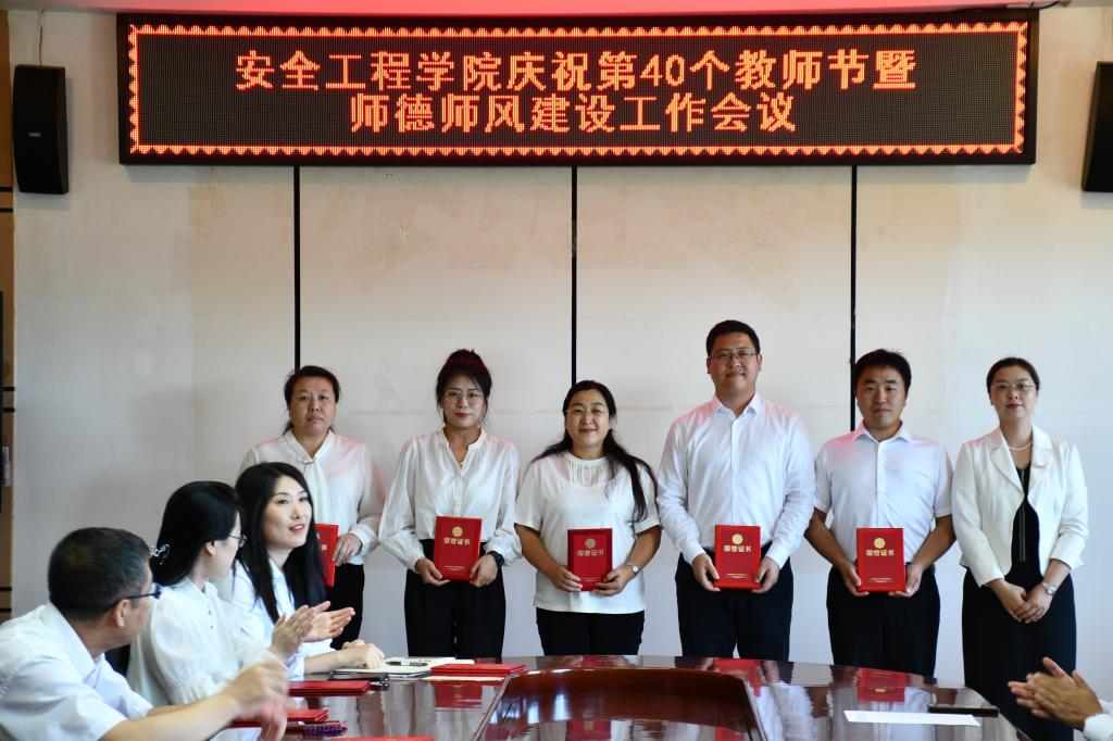 12/ 2024-09安全工程学院组织召开庆祝第40个教师节暨师德师风建设工作会议为庆祝第40个教师节,营造尊师重教的良好风尚,9月10日下午,安全工程学院组织召开了庆祝第40个教师节暨师德师风建设工作会议。学院全体教职工参加了会议,会议由学院党委副书记郑红岩主持。会上,为进一步加强学院师德师风建设,院长徐锋组织全体教职工学习了《新时代高校教师职业行为十项准则》等师德师风建设相关材料;副书记郑红岩宣读了学院开展的“我心目中的好老师”评选结果;副院长沈斌宣读了学院教学大赛评选结果;学...