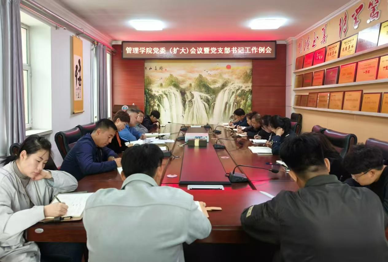 24/ 2024-09管理学院召开党委(扩大)会暨党支部书记工作例会为深入学习贯彻党的二十届三中全会精神和全国教育大会精神,全面做好本科教育教学审核评估准备工作,9月20日,管理学院在三楼会议室召开党委(扩大)会议暨党支部书记工作例会。学院党委班子成员、教师和学生党支部书记、系主任及全体辅导员参加会议,会议由学院党委书记何景洋主持。会上,通过“第一议题”集中学习了习近平总书记在全国教育大会上的重要讲话精神和习近平总书记关于党纪学习教育作出的重要指示精神。传达学习了学校党的建设工作领导小组(扩大)会议精神,领学了《中共中央 国务院关于弘扬教育家精...
