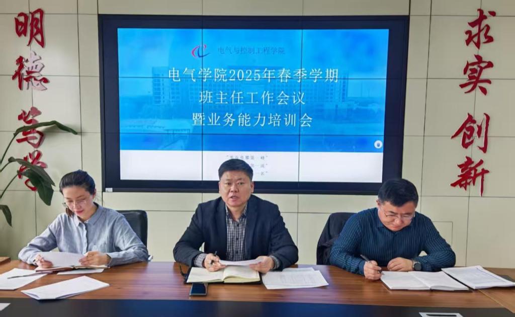 26/ 2025-03电气学院召开2025年春季学期班主任工作会议暨业务能力培训会为进一步强化班主任队伍建设,提高班主任业务素质能力,3月25日中午,电气学院在朝阳楼0809会议室组织召开了2025年春季学期班主任工作会议暨业务能力培训会,学院全体辅导员、班主任参加会议,会议由学院党委副书记侯树成主持。会上,学工办主任张孟洁安排部署近期学生教育管理服务重点工作,并针对学生学业预警专项工作进行了业务培训。副处级辅导员韩大伟对毕业生就业以及德育答辩工作进行了安排部署,并就大学生德育实践组织实施与具体指导的规范程序进行了培训。最后,侯树成作了总结讲话,对全体班主任...