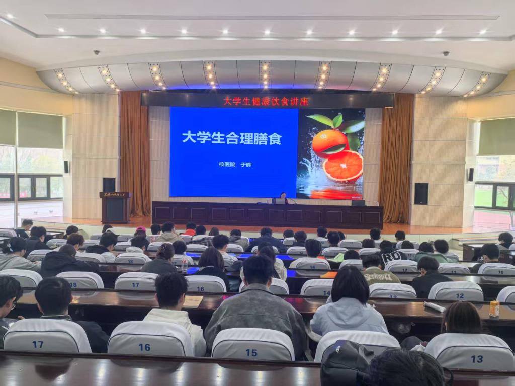 21/ 2025-04学校举办大学生健康饮食主题讲座助力学生营养素养提升4月21日上午,后勤管理处联合学生处举办大学生健康饮食专题讲座,活动特邀校医院卫生防疫中心干事于辉老师担任主讲,200余名学生参加本次活动。本次讲座以大学生合理膳食为主题,为学子们带来一堂生动实用的健康科普课。科学理论结合实例,解码营养膳食核心。于辉老师以《中国居民膳食指南》为依据,系统阐释营养膳食的概念。强调营养膳食需满足“全面、均衡、适度”三原则,提倡食物多样性摄入与营养素的科学配比。通过展示“膳食宝塔”模型,详细拆解了谷薯类、蔬果、蛋白质等各类食物的日均推荐摄入量,并结合...