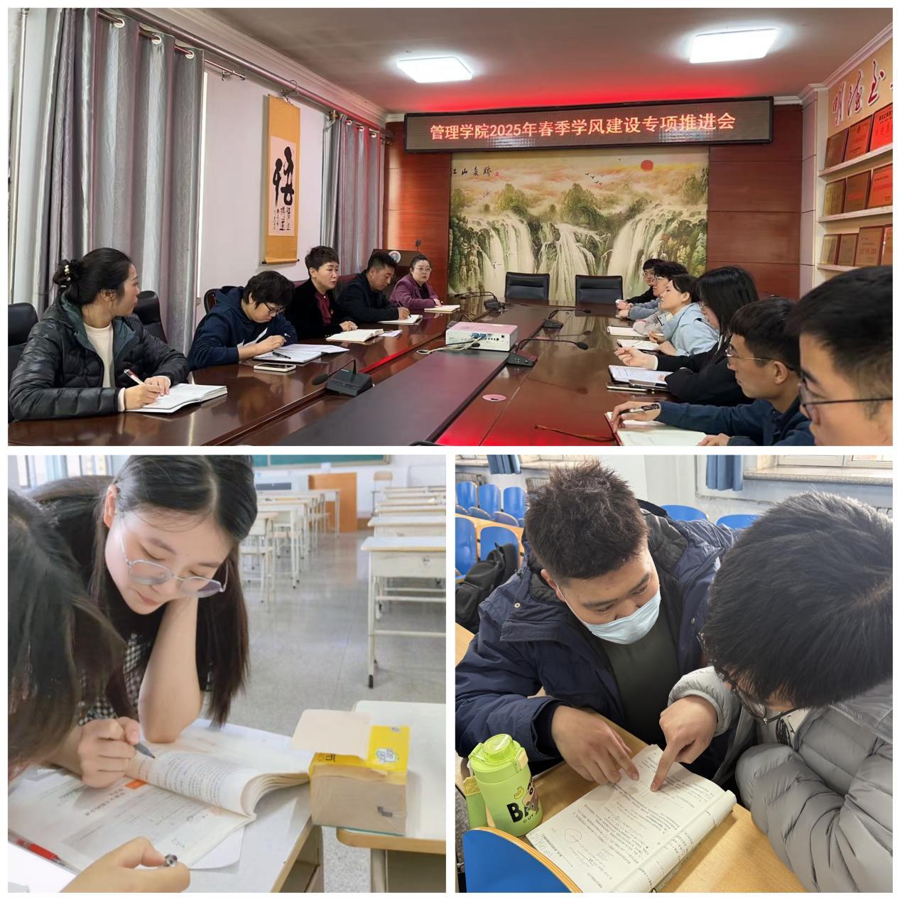 07/ 2025-05管理学院多维筑基育学风 协同赋能促成长开学以来,管理学院以实施“学风建设工程”为载体,以推进学院“五个一流”建设为目标,多维发力,扎实开展促学风八项行动,做好学生成长成才路上的知心人、热心人和引路人,切实增强学生学习动力,培育优良学风。精准引导分层施,增强信心育学风。学院尊重学生个体差异,深入了解学习困难学生情况,分类指导,鼓励个性发展。在全院109个班级中开展学风建设“优秀自习班集体”评选活动,以班级为单位进行学业成绩分析和学风评估。制度护航严管理,动态跟踪正学风。学院建立学风预警档案,完善落实“学校、家长、学生...