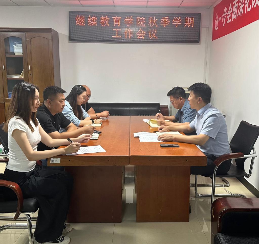 25/ 2025-08继续教育学院召开2025年秋季学期开学工作会议8月22日,继续教育学院在学院办公室召开秋季学期开学工作会议,学院全体职工参加会议,会议由陈培友书记主持。会议传达了学校秋季学期开学工作会议精神,对学院新学期工作进行全面部署。会上,院长苏东辉对学院上半年工作进行总结和分析,围绕新学期重点工作提出三点要求,一是以规范办学行为为目的,持续加强教学点建设与管理;二是以提高教学质量为核心,不断深化教育教学改革;三是以提升社会效益为根本,积极拓展非学历教育培训。并就持续深挖招生资源、抓实教育教学管理、修订完善工作制度、规范学籍档案管理、...