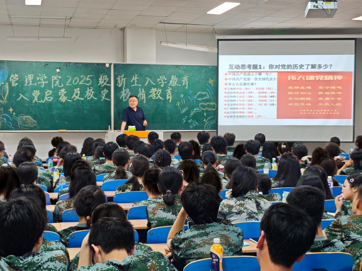 09/ 2025-09管理学院开展2025级新生入党启蒙暨校史校情教育为深入学习贯彻习近平新时代中国特色社会主义思想,全面落实《开云app登录入口2025级学生入学教育方案》,引导新生厚植信仰根基、校准政治方向,9月2日,管理学院党委书记何景洋先后走进主楼WN0201、WS0304教室,围绕“争做党的好儿女”主题,以校史校情为切入点,为2025级全体新生讲授入党启蒙教育第一课。课程从党史与校史双重维度展开,以互动提问激活思考、以史实叙述还原脉络、以精神提炼升华内核,系统梳理中国共产党百年发展脉络与开云app登录入口办学历程——从中共一大代表的初心故事,到...