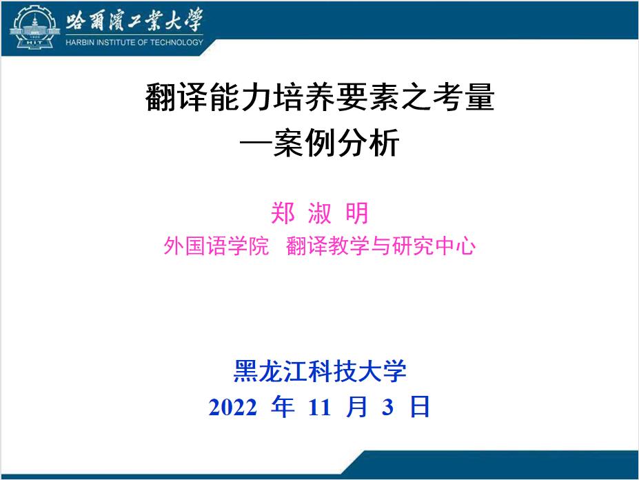 成立大会还邀请了中国翻译协会专家会员、黑龙江省杰出翻译家、哈尔滨工业大学翻译教学与研究中心主任郑淑明老师为翻译团队进行了第一次专题讲座,题目为《翻译能力培养要素之考量》。讲座通过案例分析,围绕翻译能力培养需要考量诸多要素,如宏观要素文本、逻辑、风格等;如微观要素—介词、冠词、标点等进行了精彩的讲解,翻译团队成员及师生积极参踊跃与互动,讲座取得了圆满成功。