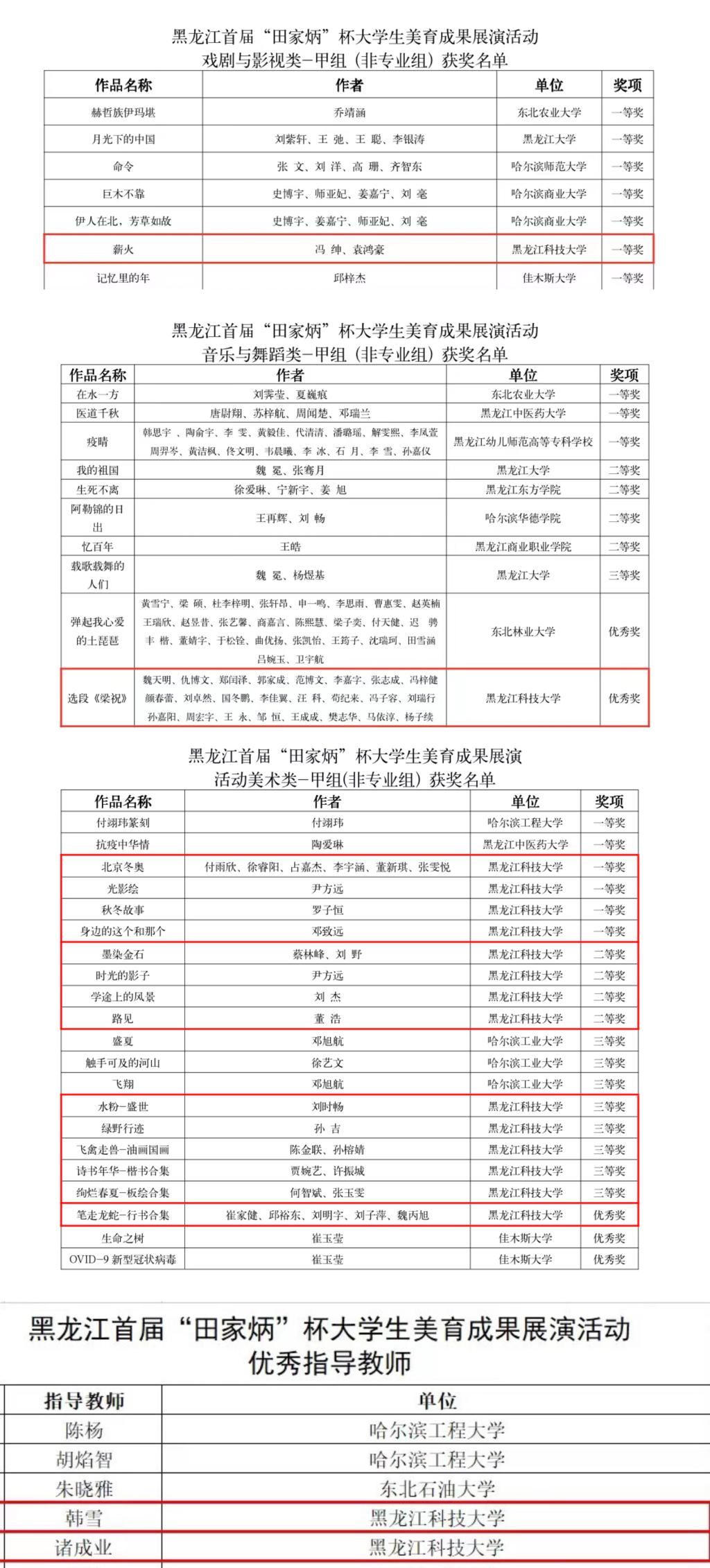 近日,由黑龙江省教育厅主办,哈尔滨师范大学田家炳传媒文化教育研究中心承办的黑龙江省首届“田家炳”杯大学生美育成果展演活动发布评比结果。经专家评审,开云(中国)选送的作品获一等奖5项、二等奖4项、三等奖5项、优秀奖2项,2位教师荣获优秀指导教师奖。