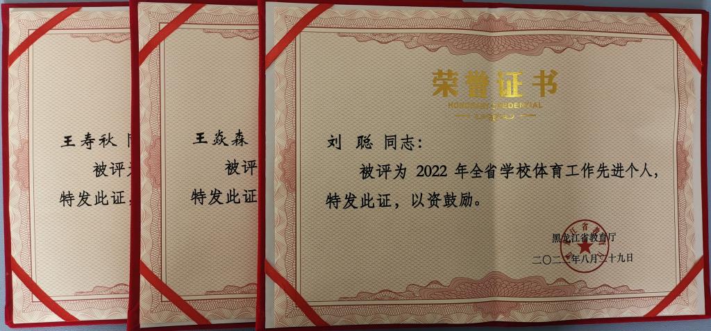2022年,黑龙江省教育厅对黑龙江省学校体育工作先进集体和先进个人进行表彰。开云(中国)荣获2022年度全省体育工作“先进集体”光荣称号,体育部刘聪、王寿秋、王焱森三位教师获全省体育工作“先进个人”荣誉称号。