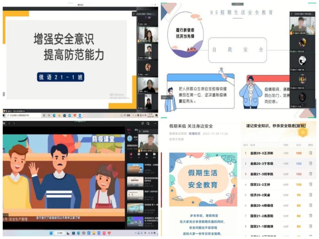 开展假期生活安全教育。近日,学生们陆续返乡,做好假期的疫情防护是假期生活的首要工作,各学院通过线上答题、观看相关案例短片、班会等多种方式教育引导学生注意外出游玩安全、交通安全、食品安全等,合理、科学地安排学习、阅读、娱乐、锻炼和休息等作息时间,做到娱乐学习两不误。