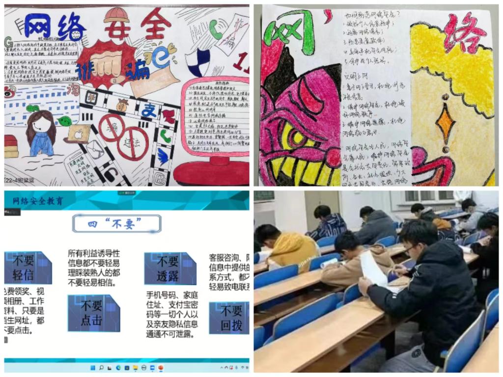 开展网络安全教育。为进一步增强学生的网络安全意识和安全防护技能,提升基本的应对网络风险的能力。各学院广泛开展网络安全宣传教育活动,通过制作手绘作品、举办网络安全知识答题竞赛、学习真实案例等方式,增强学生网络安全意识,加强网络舆情监控和意识形态方面的宣传工作,不信谣、不传谣、弘扬主旋律,营造安全、健康、文明的网络环境,切实维护国家及校园的网络安全。