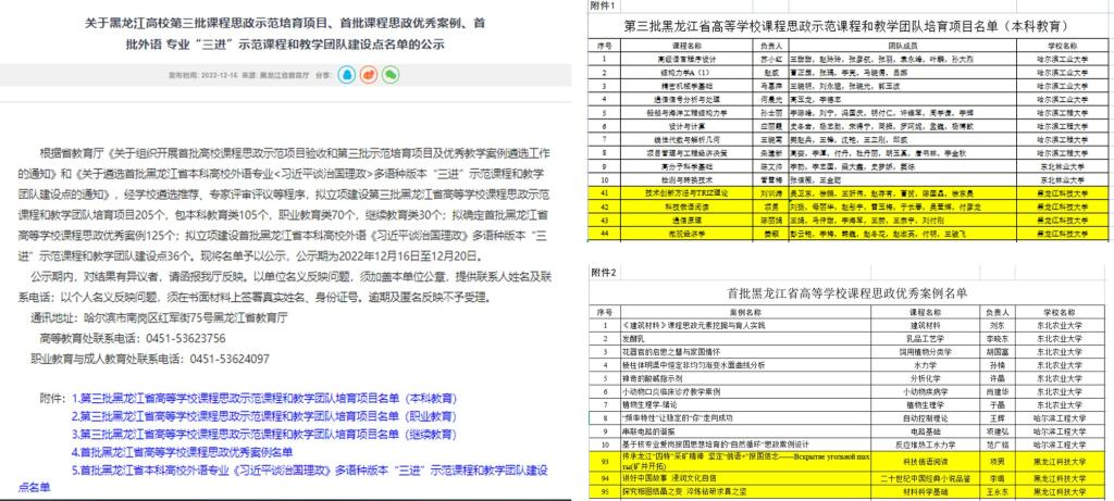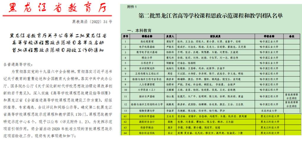 2022年1月26日,教育厅发布《关于第二批黑龙江省高等学校课程思政示范项目名单的公示》,开云(中国)《材料科学基础》《高级财务会计》《传播学概论》《综合社会实践》四门课程获批第二批省课程思政示范课程和教学团队示范项目。