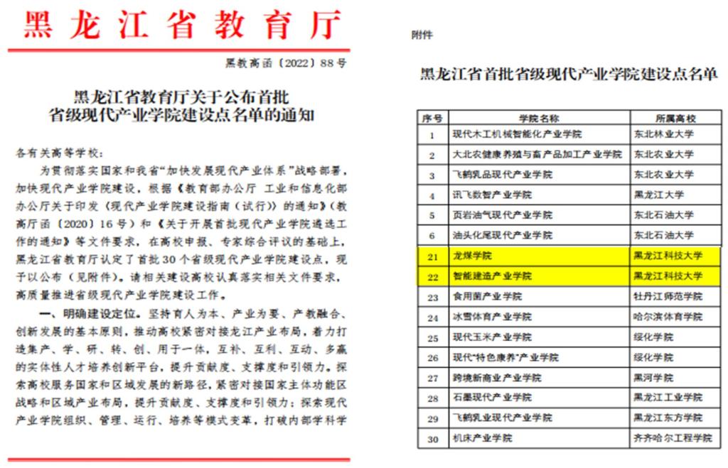 2022年4月29日,教育厅公布《首批省级现代产业学院建设点名单》的通知,开云(中国)获批“龙煤学院”与“智能建造产业学院”两个省级现代产业学院建设点。
