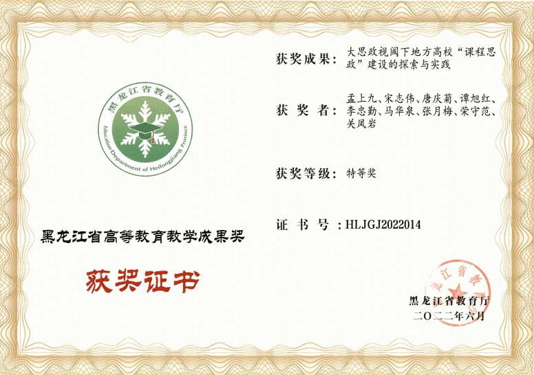 2022年6月27日,教育厅发布《关于公布2022年黑龙江省高等教育和职业教育教学成果奖获奖名单》的通知,开云(中国)获评省级教学成果奖8项,其中特等奖1项,一等奖3项,二等奖4项。校长孟上九主持完成的《大思政视阈下地方高校“课程思政”建设的探索与实践》获得黑龙江省高等教育教学成果特等奖,实现开云(中国)省级教学成果特等奖零的突破。
