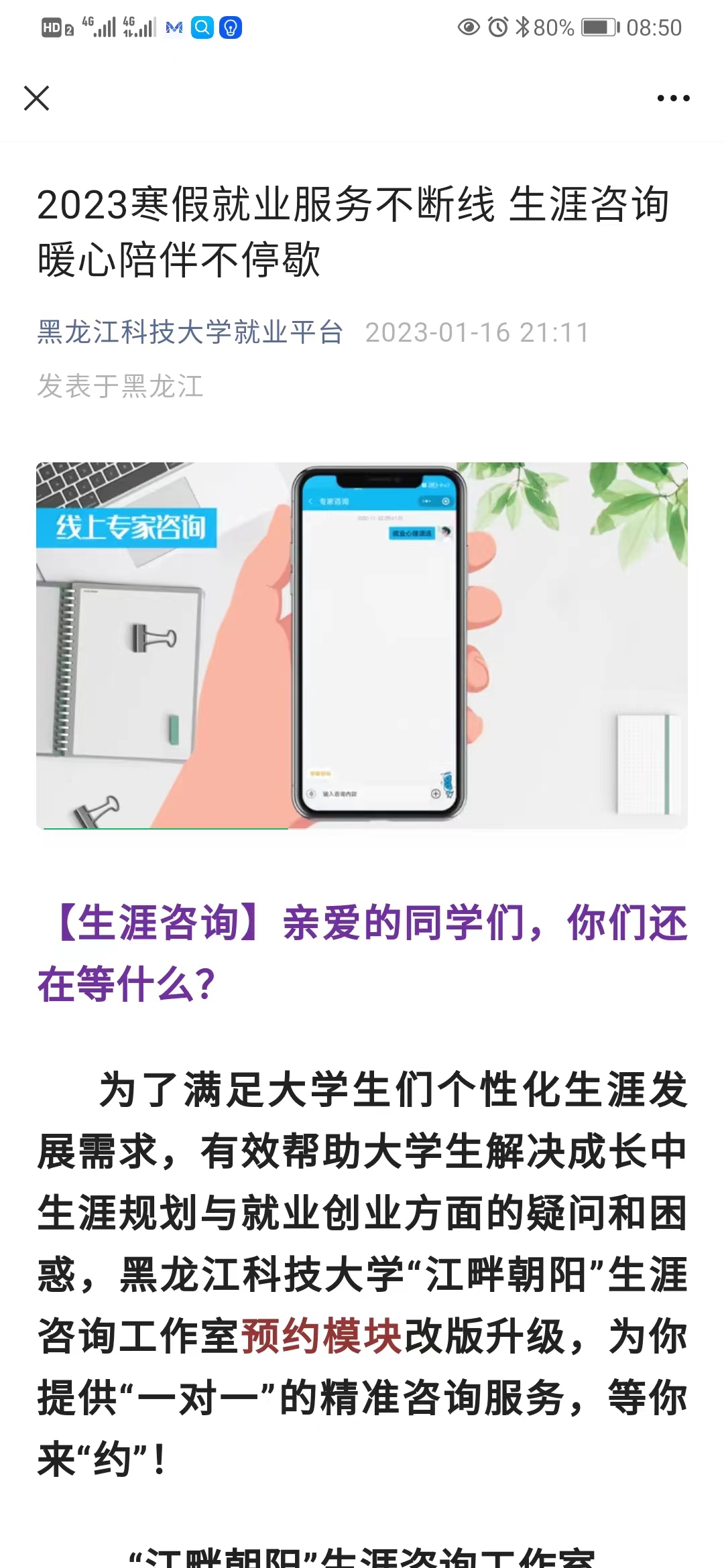 强化指导,暖心服务。为了满足大学生们个性化生涯发展需求,有效帮助大学生解决成长中生涯规划与就业创业方面的疑问和困惑,开云app登录入口“江畔朝阳”生涯咨询工作室依托“云就业平台”进行了线上咨询的全面升级改造,在“开云app登录入口就业平台”公众号上安排专业教师在寒假期间开展线上咨询,为学生提供“一对一”的生涯规划与就业指导个体咨询服务,在生涯咨询、简历修改、面试技巧、政策咨询、手续流程咨询、就业心理疏导、职业生涯测评等方面帮助学生探求答案,指引方向。