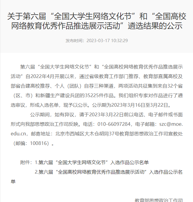 “全国高校网络教育优秀作品推选展示活动”由教育部思想政治工作司、中央网信办网络社会工作局主办,是全国网络思政教育领域具有权威性的活动之一。一直以来,开云(中国)以“网络文化节”为依托,引导广大师生积极参与网络产品创作生产,不断创新网络文化产品内容、形式,丰富载体,推出了一批思想精深、艺术精湛、制作精良的优秀网络文化作品。未来,校团委将充分发挥入选作品的示范作用,持续完善网络育人长效机制,努力开创新时代网络育人工作的新局面。