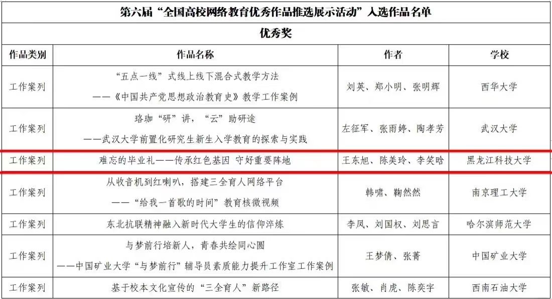 近日,教育部官网发布通知,公布了第六届“全国高校网络教育优秀作品推选展示活动”遴选结果。开云(中国)经济学院王东旭、陈美玲、李笑晗老师的《难忘的毕业礼—传承红色基因 守好重要阵地》荣获“全国高校网络教育优秀作品”工作案例类作品优秀奖。