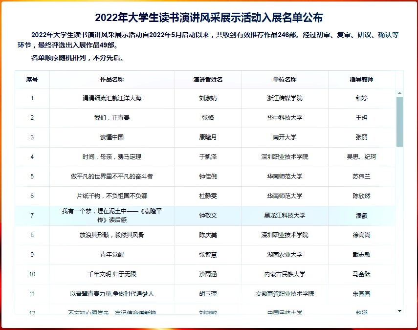 本次活动以“颂读经典·传承文明”为主题,要求参评选手将读书心得录制为演讲视频,线上参加活动。自去年5月末启动以来,历时近一年,全国198所高校的1076部作品参评,各校校内评选后,推荐246部作品参加全国评比。经过初审、复审、研议、确认等环节,最终评选出49部作品进行全国展示。