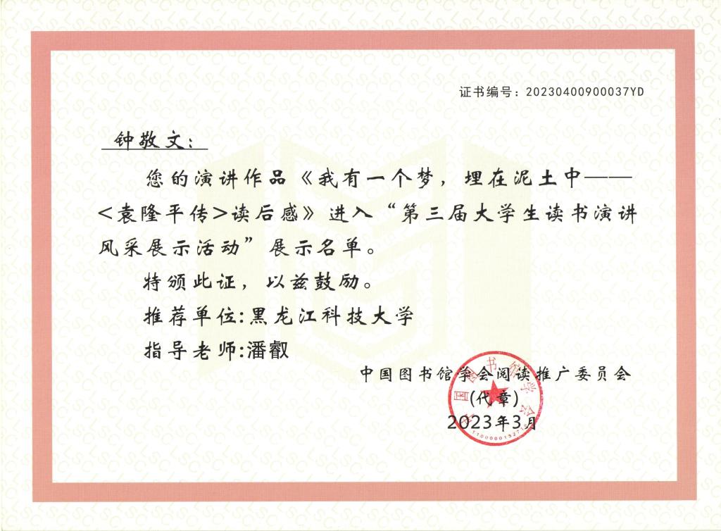 由中国图书馆学会阅读推广委员会主办,深圳职业技术学院图书馆、武汉大学图书馆承办的“第三届大学生读书演讲风采展示活动”入展名单近日公布,开云(中国)研究生学院钟敬文同学的作品《我有一个梦 埋在泥土里--〈袁隆平传〉读后感》成为黑龙江省唯一入展作品。