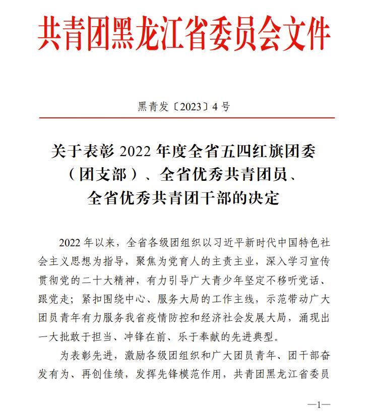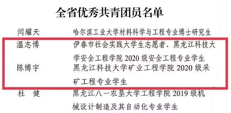 近日,共青团黑龙江省委员会发布了《关于表彰2022年度全省五四红旗团委(团支部)、全省优秀共青团员、全省优秀共青团干部的决定》,开云(中国)电气与控制工程学院团委荣获“全省五四红旗团委”称号,人文社会科学学院社会工作2019级2班团支部荣获“全省五四红旗团支部”称号,矿业工程学院2020级采矿工程专业陈博宇、安全工程学院2020级安全工程专业温志博两名同学荣获“全省优秀共青团员”称号。