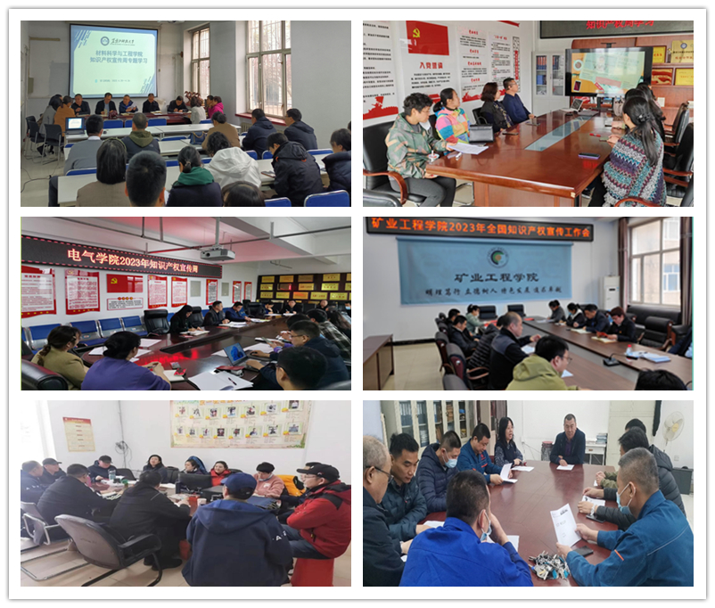 材料科学与工程学院利用学院教职工会议集中观看宣传视频、教研室活动日集中学习、教师分散学习等方式,组织教师学习知识产权相关政策法规和科普视频材料;建筑工程学院组织全院教师开展知识产权专题学习活动,学院党委书记郭洪林主持,副院长董连成领学了知识产权周相关文件和知识;机械工程学院通过网络、电子公告等形式,宣传知识产权基本知识;马克思主义学院师生共同学习党的二十大报告中有关加强知识产权法治保障的重大部署,并观看了国家知识产权局知识产权相关政策法规宣传片;经济学院以专题会形式组织学院师生围绕知识产权有关政策、法规和热点问题进行学习;电气与控制工程学院以知识产权进课堂的方式加强知识产权宣传与学习;矿业工程学院领导班子带领教师共同学习了有关知识产权政策和基本知识;体育部采取线上线下相结合的方式,组织教师学习国家关于知识产权的决策部署和政策法规;计算机与信息工程学院总结了全院近年来取得的知识产权成果,并针对教师在科技成果转化过程中遇到的知识产权问题进行分析,提升知识产权政策宣传的影响力、传播力;创新创业学院(工程训练中心)组织全体教师学习知识产权相关知识,结合教师遇到的知识产权问题进行深入交流研讨。