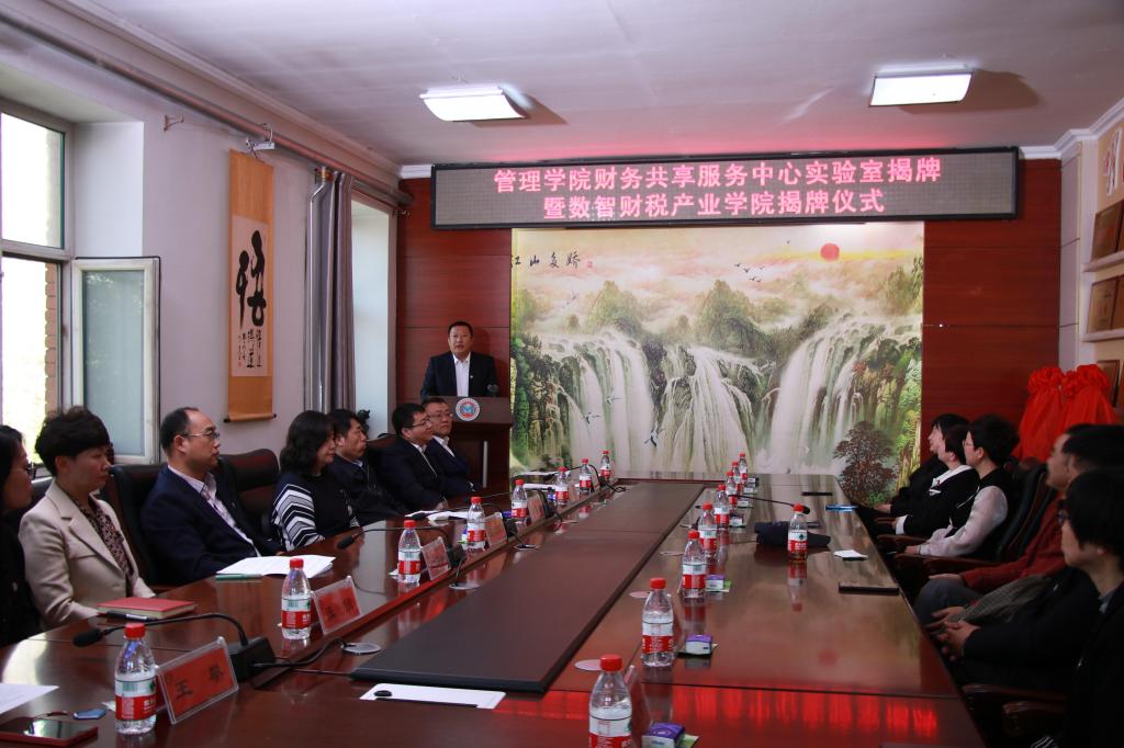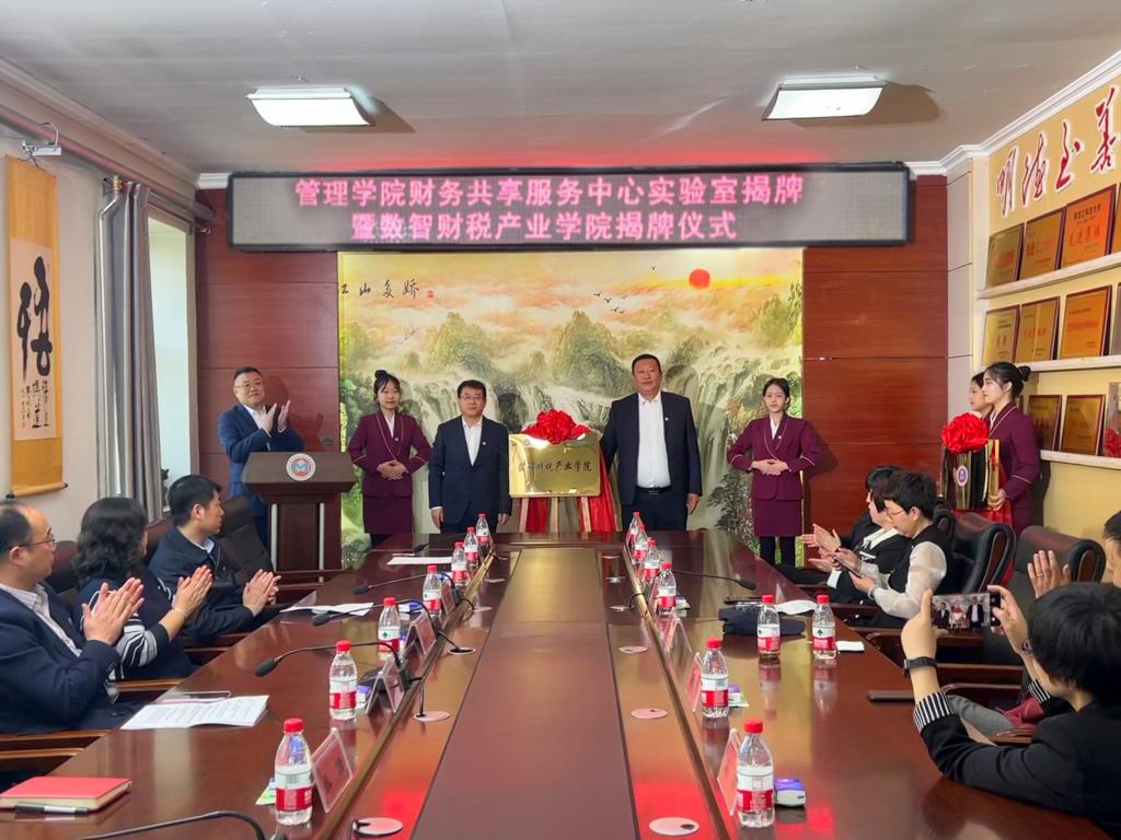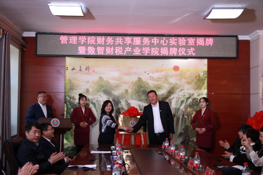 副校长谭旭红、管理学院副院长洪亮分别和黑龙江航天信息有限公司总经理任海鹏为“财务共享服务中心实验室”和“数智财税产业学院”揭牌。