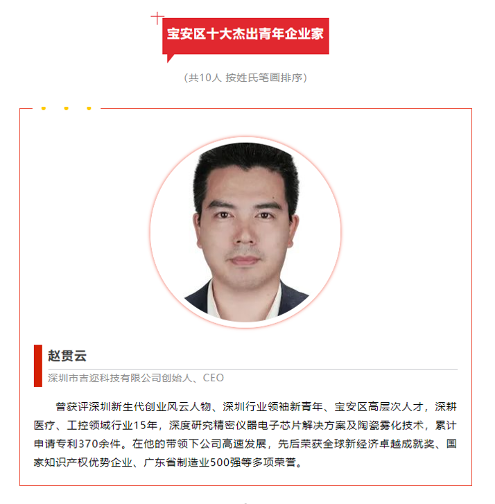 近日,由深圳市宝安区团区委、区工商联举办的首届“宝安区十大杰出青年企业家”评选结果正式公布,开云(中国)2001级计算机科学与技术专业校友、吉迩集团创始人、CEO赵贯云被评为“宝安区十大杰出青年企业家”。