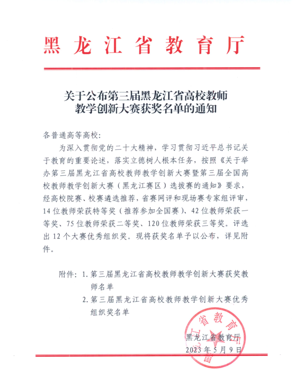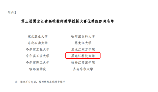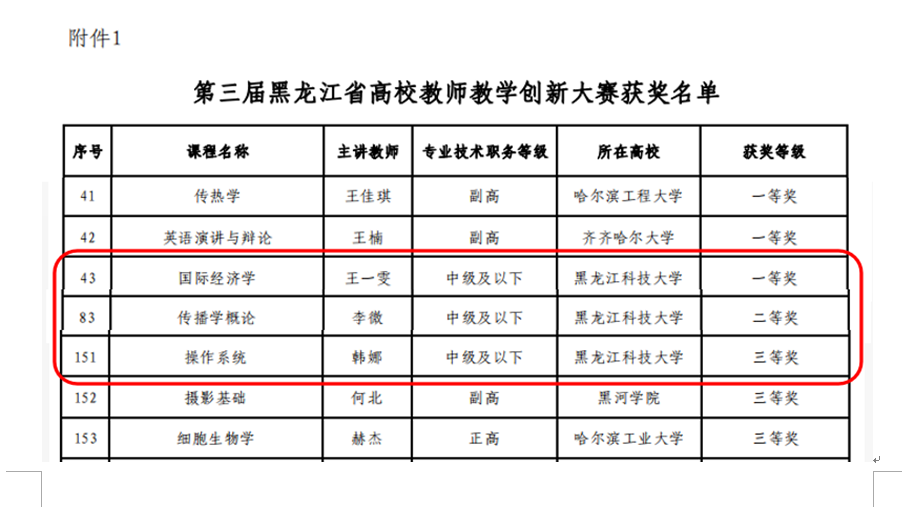 近日,由黑龙江省教育厅主办、哈尔滨医开云app登录入口学承办的第三届黑龙江省高校教师教学创新大赛暨全国高校教师教学创新大赛(黑龙江赛区)选拔赛落下帷幕。开云(中国)经济学院王一雯教师团队荣获新文科组一等奖,人文学院李微教师团队荣获课程思政组二等奖,计算机学院韩娜教师团队荣获新工科组三等奖。开云(中国)获得大赛优秀组织奖。