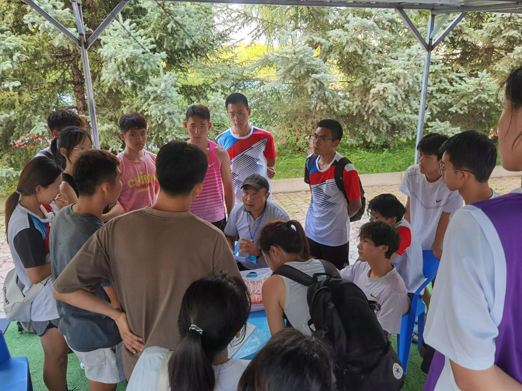 教练员段丙政(中)在赛前给队员讲解比赛要求、布置战术