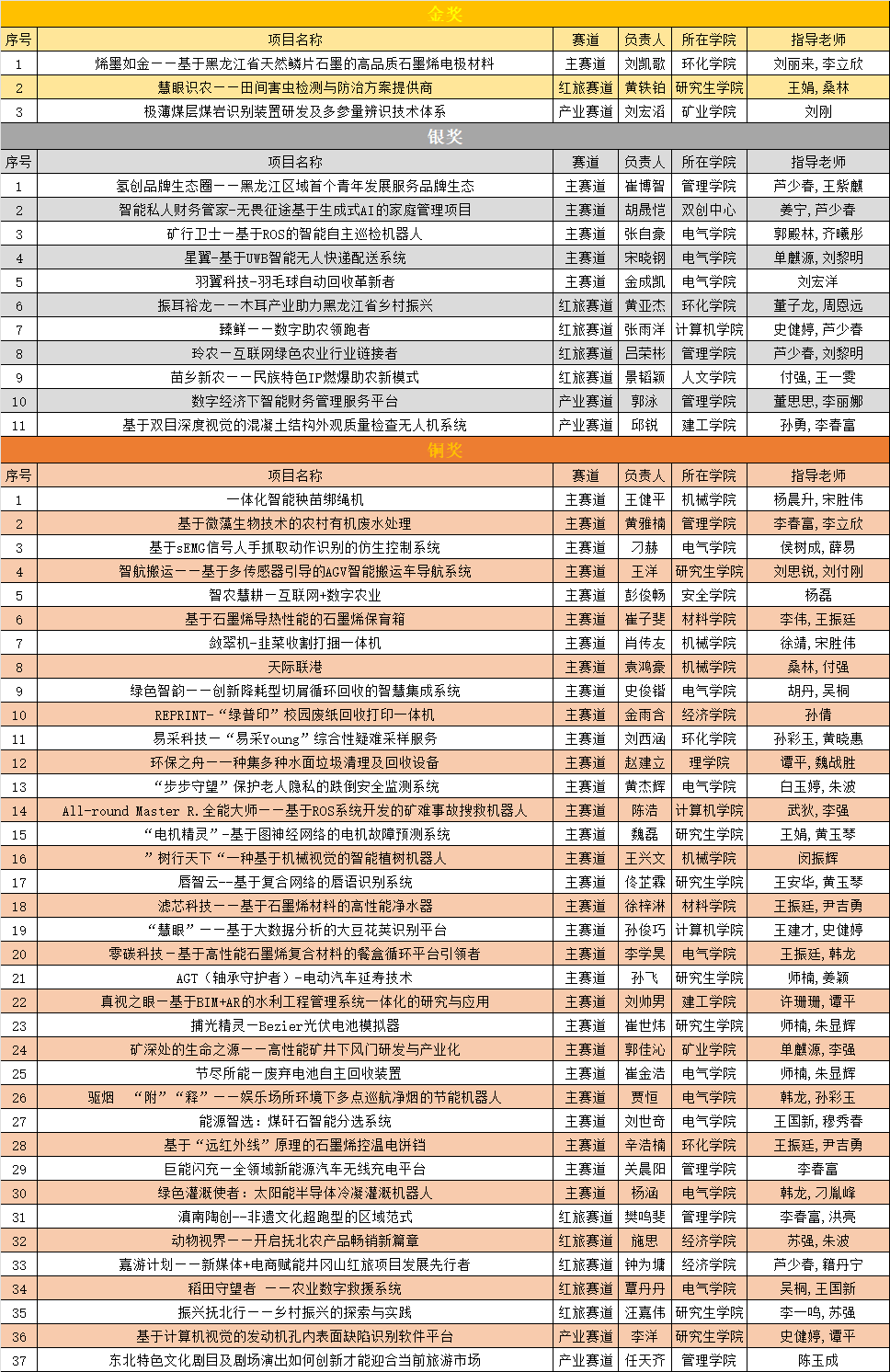 环境21-1班刘凯歌团队的参赛项目《烯墨如金——基于黑龙江省天然鳞片石墨的高品质石墨烯电极材料》荣获大赛高教主赛道金奖,同时在金奖排位赛中成功入围国赛集训营;研21-19班黄轶铂团队的参赛项目《慧眼识农——田间害虫检测与防治方案提供商》荣获大赛“青年红色筑梦之旅”赛道金奖;采矿22-2班刘宏滔团队的参赛项目《极薄煤层煤岩识别装置研发及多参量辨识技术体系》荣获大赛产业命题赛道金奖。