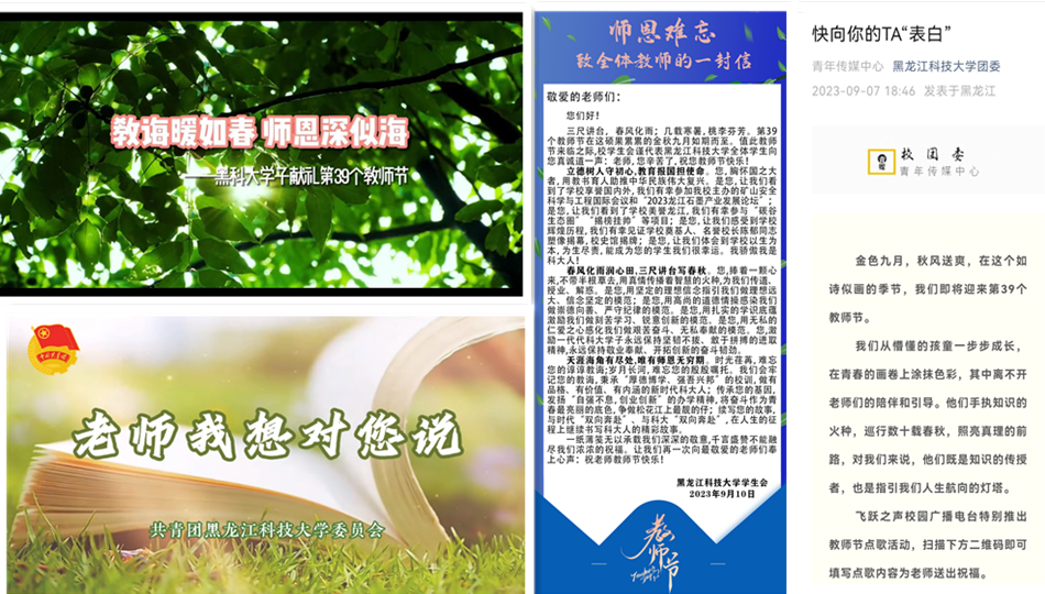各级各类团学组织广泛开展了教师节点歌活动、录制祝福视频、为老师亮盏灯、绘制手抄报、向全体教师致一封信、为老师做书法、为老师送上祝福贺卡等活动,广大青年学生以自己的方式向全校教师表达着他们深深的敬意和节日最美好的祝福。