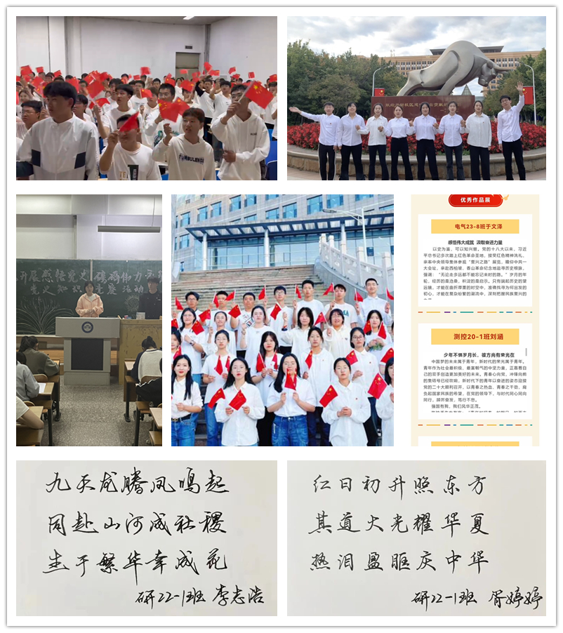 寄诚之语,激励青年学生传承红色基因。电气学院团委开展“愿以寸心报华夏、且将岁月赠山河“主题征文活动,表达同学们的爱国之情、报国之志,弘扬了爱国主义主旋律。经济学院团委开展“我和我的祖国”合唱活动,用最优美的旋律、最深情的演唱,展现了新中国走过的74年光辉历程。外国语学院团委、材料学院团委通过开展爱国歌曲传唱活动,使青年学子用歌声牢记党的嘱托,明确肩负使命。马克思主义学院团委开展“感悟党史磅礴伟力、礼赞祖国盛世华诞”党史知识竞赛,带领青年学生回顾中国共产党从成立到发展壮大的百年历程。研究生学院团委以喜迎国庆为主题举办“三行诗”征集活动,以纸短情长,词深情亦深的三行情诗为祖国献礼,展示青年学子的爱国情怀。