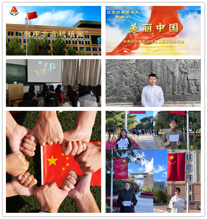 掌红之镜,勉励青年学生担当时代大任。摄影协会、建工学院团委、人文学院团委开展了“国旗下的合影”活动,晒出浓浓爱国情,进一步激发青年学子时代责任感和使命感,增强民族自豪感。管理学院团委、理学院团委分别组织青年学生观看爱国影片,进一步引导同学们听党话、跟党走,坚定理想信念,增强民族自豪感和文化认同感。安全学院团委录制祝福祖国视频,通过一句句质朴的语言,来自五湖四海的同学们,用最朴实的家乡话,为祖国母亲送上最诚挚的国庆祝福。矿业学院团委举办“我为祖国送祝福”活动,通过广大学子同祝福形式,展现“家”与“国”在时间上相连、文化上相牵,同念家国之思,感家国之情。计算机学院团委以国庆节为契机拍摄红色歌曲“美丽中国”主题MV,歌颂了祖国的壮美,抒发了青年学生对祖国的无限热爱之情。