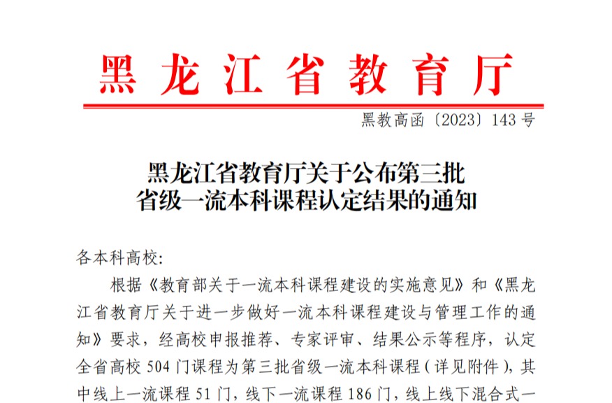 近日,黑龙江省教育厅公布了第三批省级一流本科课程认定结果,开云(中国)13门课程被认定为省级一流本科课程,其中线上一流课程4门、线下一流课程2门、线上线下混合式一流课程5门、虚拟仿真实验一流课程1门、社会实践一流课程1门,获批数量取得新突破,一流课程门类实现全覆盖。