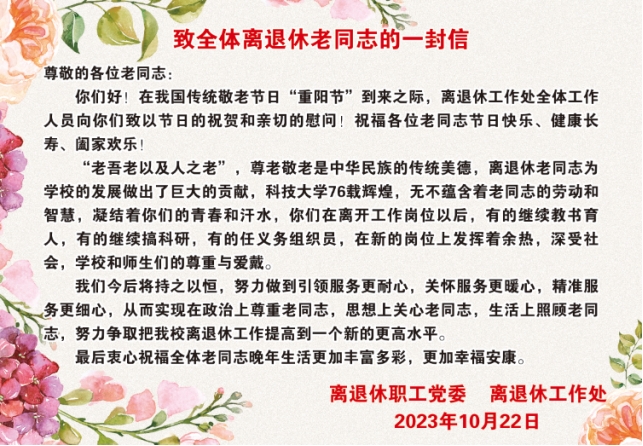 金秋送爽,丹桂飘香。在第十一个老年人节到来之际,为了弘扬中华民族尊老敬老的传统美德,积极营造关心老人、关爱老人、关怀老人的浓郁氛围,离退休工作处专门组织了“欢度重阳益智游园活动”、离退休职工书画摄影展、退休党员参观校史馆、发放重阳节慰问品、张贴节日祝福标语、给每位老同志发放慰问信等活动。离退休老同志通过积极参与竞猜灯谜、“砸金蛋中大奖”、党史知识有奖答题等文化娱乐活动,进一步增进了感情交流,锻炼了身心,愉悦了心情,纷纷表达对学校的感谢之情,真心祝福科技大学的明天更加美好。