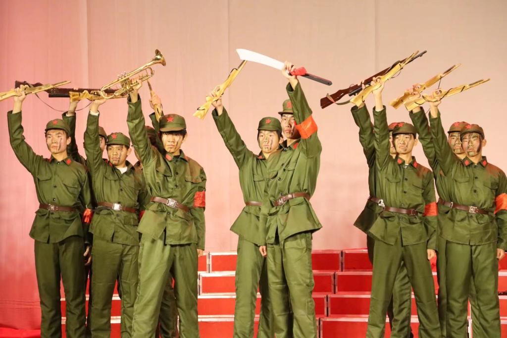 表彰大会结束后,大学生凤凰鸟艺术团、大学生合唱团、大学生仪仗队联合表演了原创红色话剧《战火红旗》。该剧由校团委社团工作部精心设计和编排,共分为9幕,演绎了在抗日战争时期,东北抗联战士不畏牺牲与日本侵略者英勇顽强斗争的故事。演员们真情投入的表演带领现场师生重回那个硝烟弥漫、血雨腥风的抗日战争年代,让观众们真切感受到“东北抗联精神”的深刻内涵和时代魅力,演出现场不时爆发出热烈的掌声。