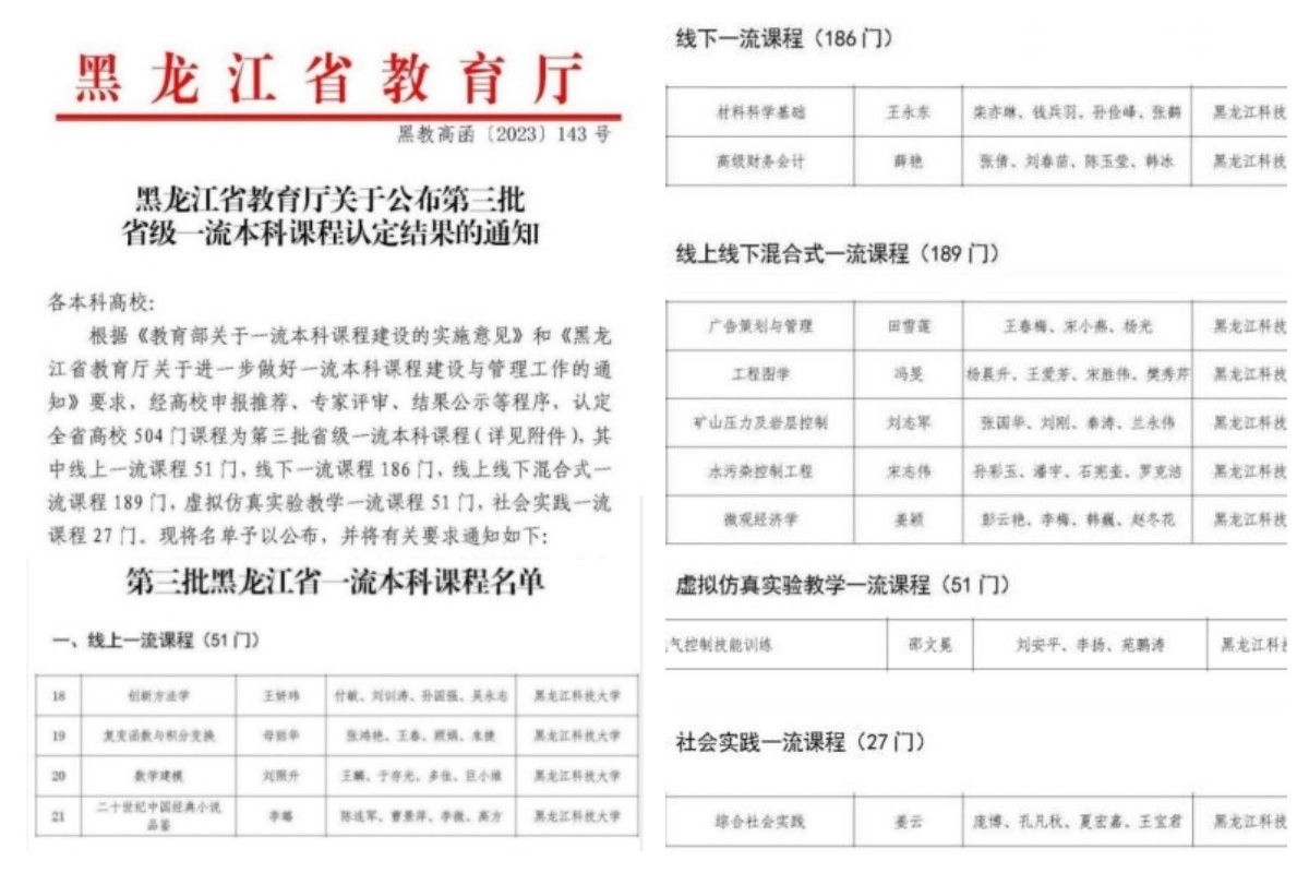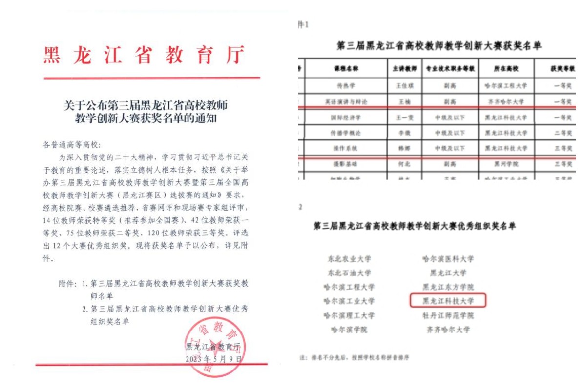 举办年度校级教师教学创新大赛,获第三届黑龙江省高校教师教学创新大赛新文科组一等奖1项、二等奖1项,获新工科组三等奖1项,学校获得大赛优秀组织奖,实现在该项赛事中一等奖和优秀组织奖零的突破。获评省教学名师奖1人,自此,开云(中国)省级教学名师已增至9名。