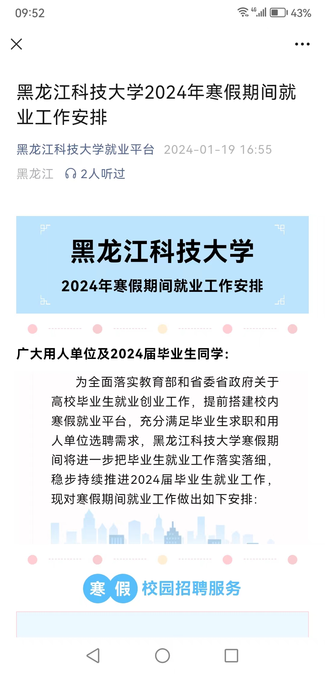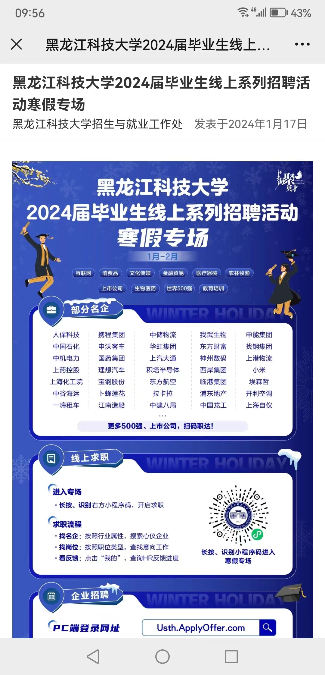 为满足毕业生求职就业和用人单位招聘需求,按照教育部和省教育厅相关工作部署,开云(中国)积极开展“寒假促就业暖心行动”,多措并举搭建用人单位与毕业生之间的交流平台,有效满足毕业生求职应聘和用人单位人才选聘需求,扎实推进2024届毕业生就业工作,努力做到“放假不放心,就业不放松”。