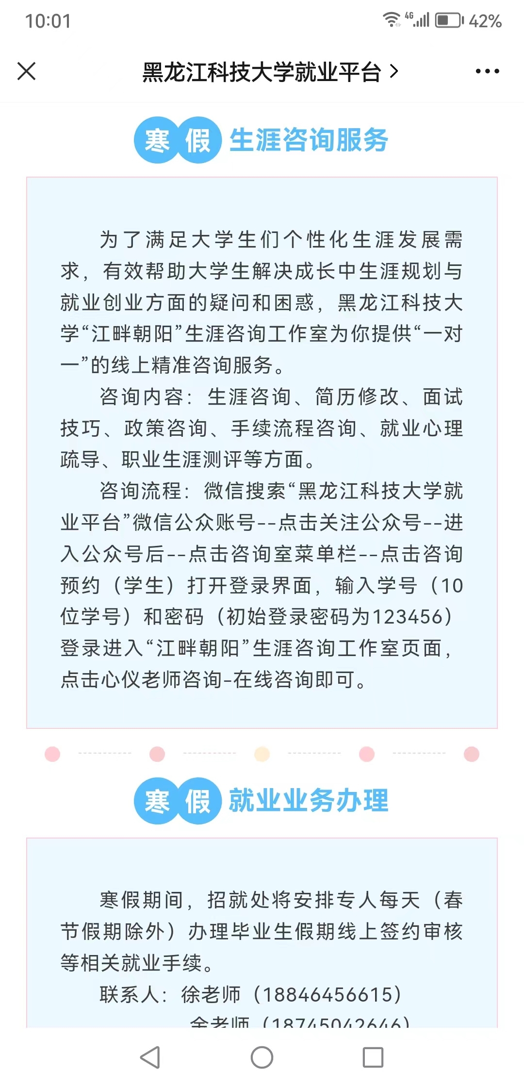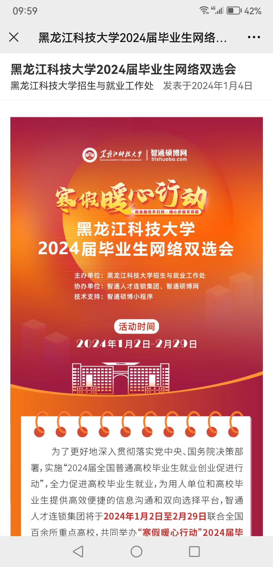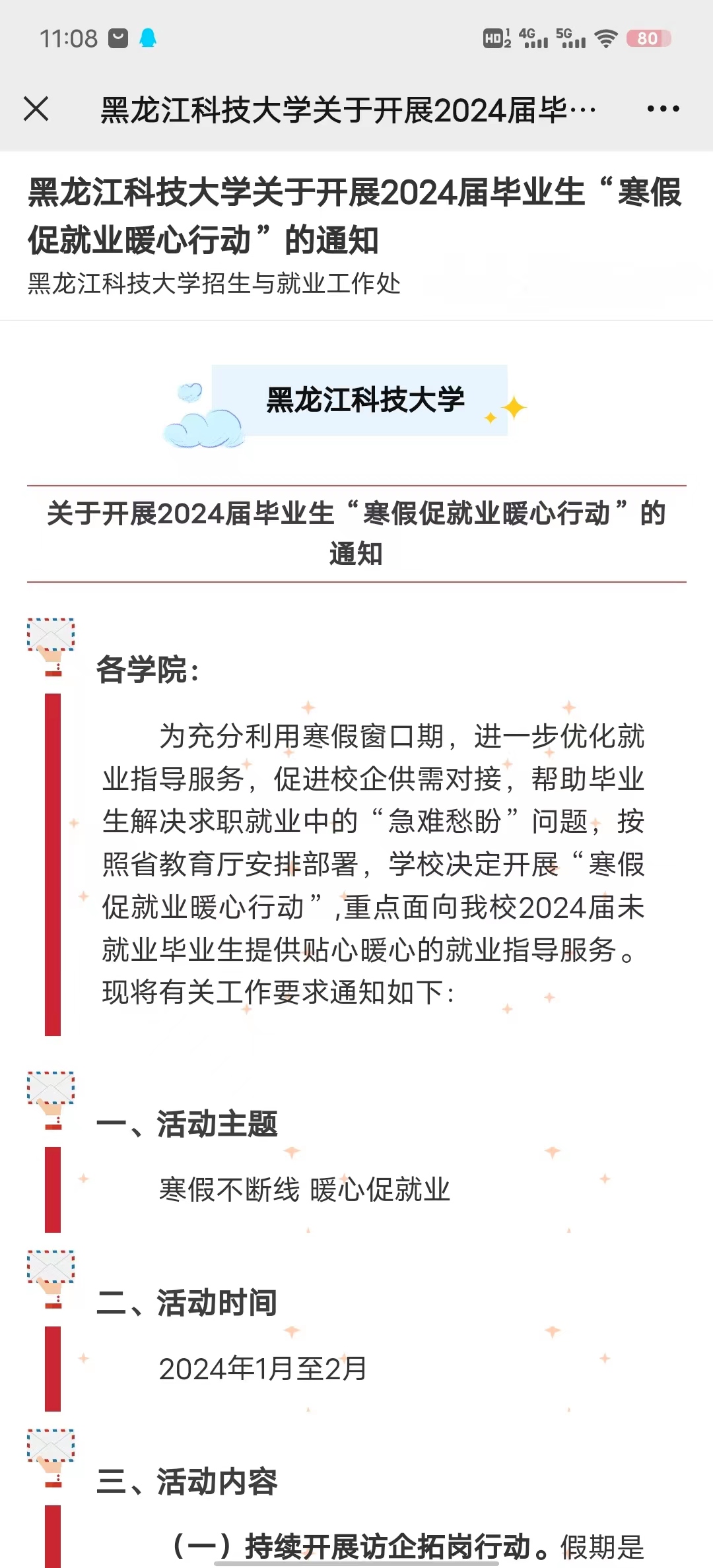 一是超前谋划,就业工作不松线。寒假伊始,招就处下发了《2024年寒假期间就业工作安排》《2024届毕业生寒假促就业暖心行动》等通知,从校园招聘服务、生涯咨询服务、就业手续办理等方面进行工作安排和部署,积极开展访企拓岗行动、岗位信息推送、就业指导服务、重点群体帮扶、就业实习实践“五个专项行动”,对各学院假期就业工作进一步明确目标,细化任务,强化措施,落实责任,确保假期就业工作有序推进,为春季开学就业工作有序启动夯实基础。