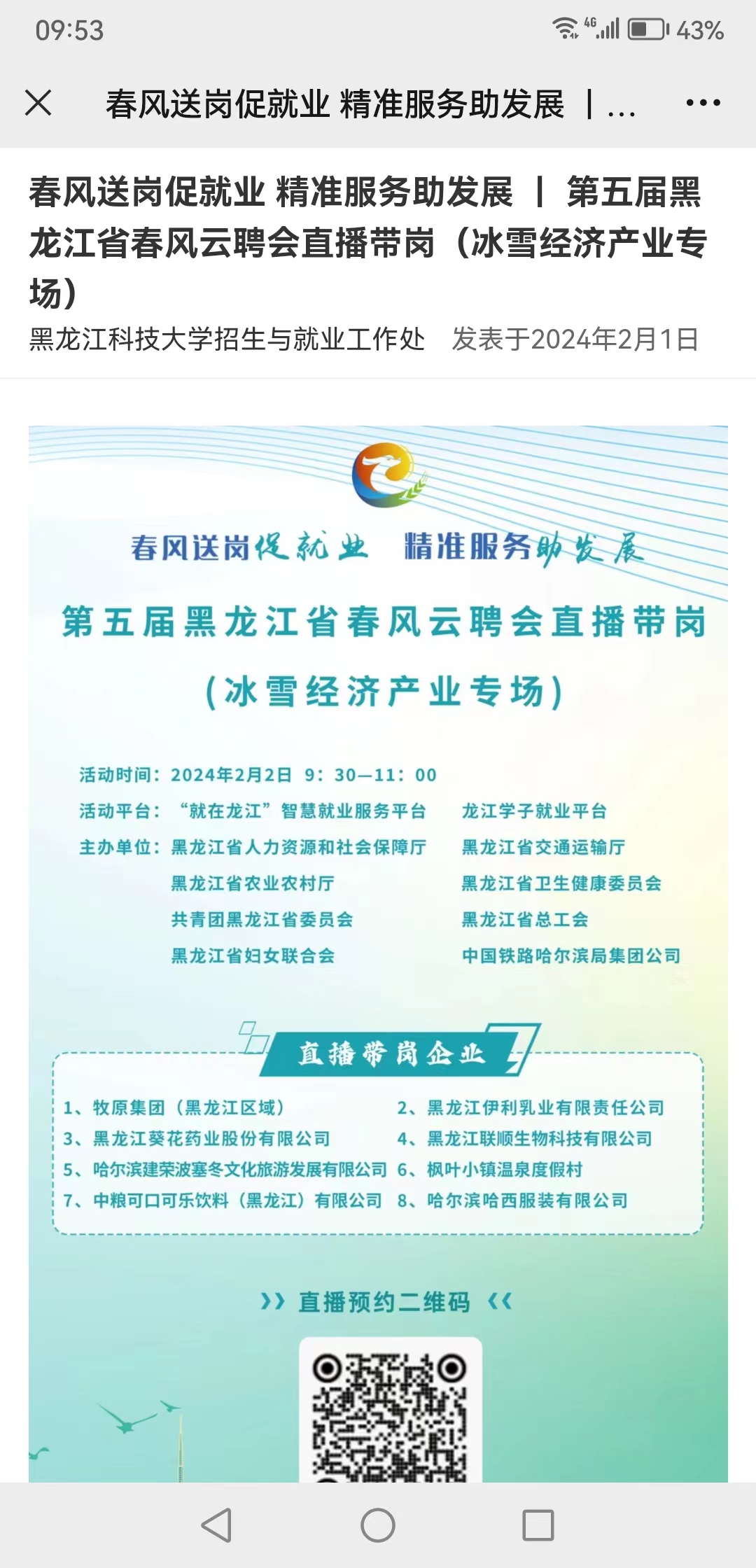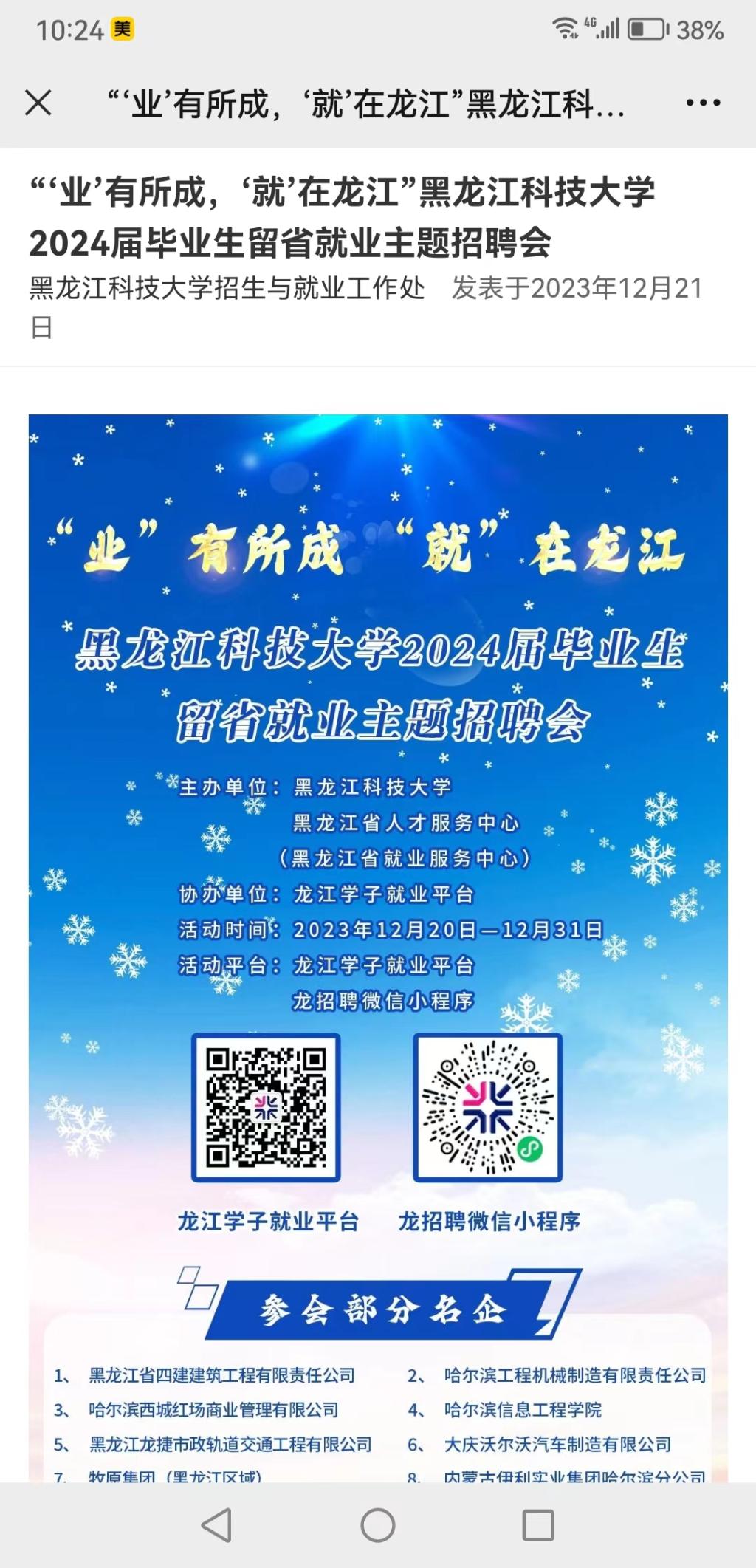 二是空中双选,网络招聘不离线。开云(中国)联合龙江学子、毕业申等平台,寒假期间开展了“服务促就业 筑梦赢未来”直播带岗活动,举办了“寒假专场”“暖心行动”“学院专场”“留省就业”等各类主题线上双选会6场,累计参会企业374家,提供2257个职位、24295个岗位;学校就业网累计发布在线招聘企业88家,提供413个职位,7025个岗位;组织毕业生参加由省人社厅举办的“黑龙江省就业服务进基层专项活动直播带岗”活动;依托教育部24365校园招聘服务平台,组织毕业生参加全国高校“一带一路区域面向高校毕业生网络招聘会”。