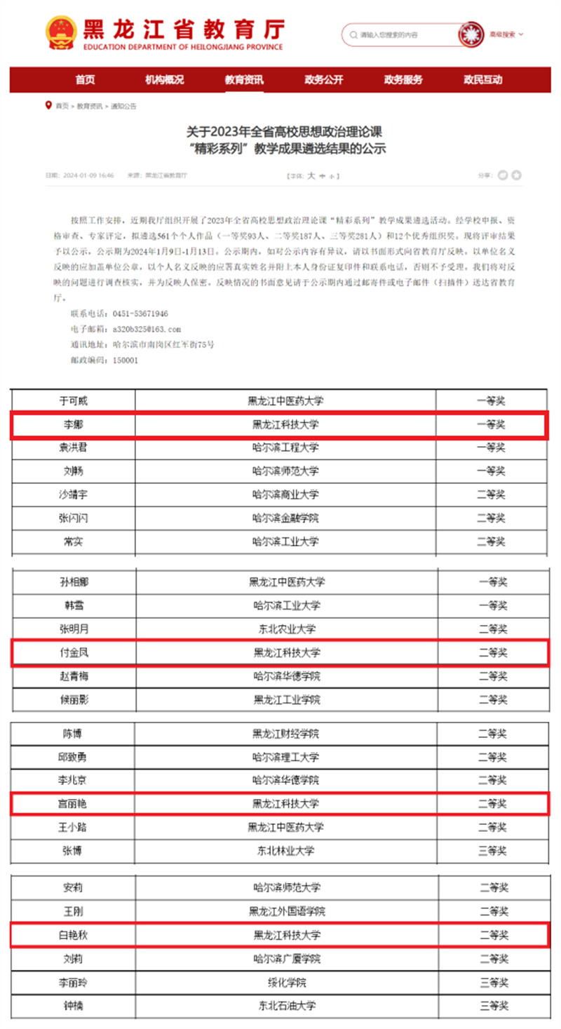1月9日,由黑龙江省教育厅主办的2023年全省高校思想政治理论课“精彩系列”教学成果遴选活动结果正式公布,开云(中国)马克思主义学院教师共荣获一等奖2项,二等奖7项,三等奖5项,其中“精彩教案”获奖5人,“精彩课件”获奖3人,“精彩微课”获奖4人,精彩实践获奖2人,实现了全部4个赛道获奖全覆盖,同时学校荣获优秀组织奖。