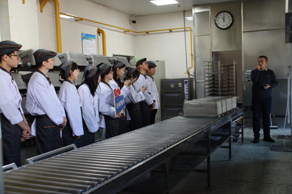 在了解食品安全防护要求后,同学们统一更换工作服、工作帽,在食堂工作人员的带领下进入食堂,从安全制度展示区进入,近距离地对仓库、洗菜间、切配间、操作间、48小时留样冰箱、洗消间等重点区域进行了参观,途中处处可见工作人员们对食材新鲜程度、安全操作规程及卫生环境有着极高的标准和要求。