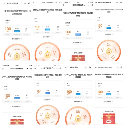 后勤工会开展了以“依法维护女职工合法权益和特殊利益”为主题的知识竞赛活动。通过小程序在线知识竞赛的形式广泛开展了《女职工劳动保护特别规定》宣传教育活动,在后勤党委的大力支持和各基层单位的全力配合下,女职工答题活动圆满成功。