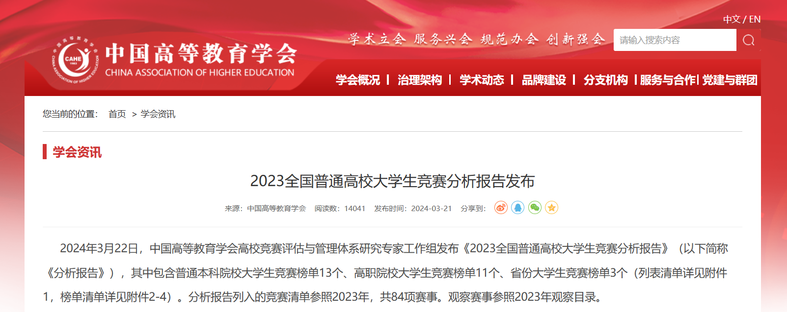 3月22日,中国高等教育学会高校竞赛评估与管理体系研究专家工作组发布《2023全国普通高校大学生竞赛分析报告》(以下简称《分析报告》),其中包含普通本科院校大学生竞赛榜单13个、高职院校大学生竞赛榜单11个、省份大学生竞赛榜单3个。