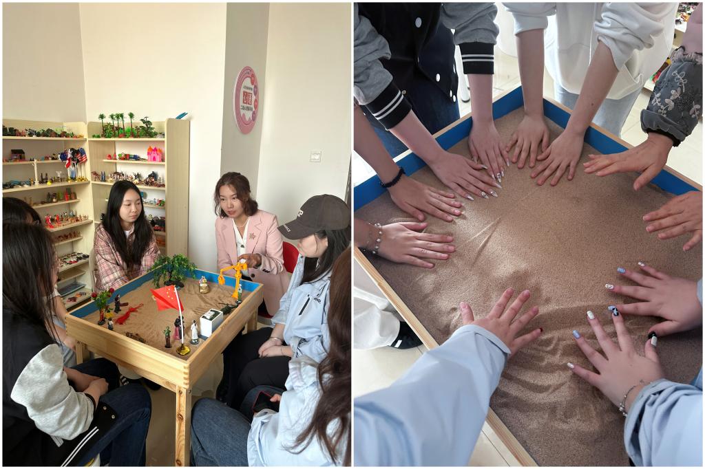 4月25日,杨凤娟组织满族、赫哲族、蒙古族等少数民族学生开展主题团体心理沙盘体验活动。同学们自主选择了国旗、中国结、石榴树、赫哲族人民、施工吊车、军人、医生、工人等沙具进行摆放,通过正念冥想、沙盘作品制作、分享交流和分析点评等环节,引发学生对自身发展与国家和民族发展的理性思考,提升学生在文化传承、责任担当中的理性认知和价值判断,点燃学生“民族团结一家亲、同心共筑中国梦”的家国情怀。